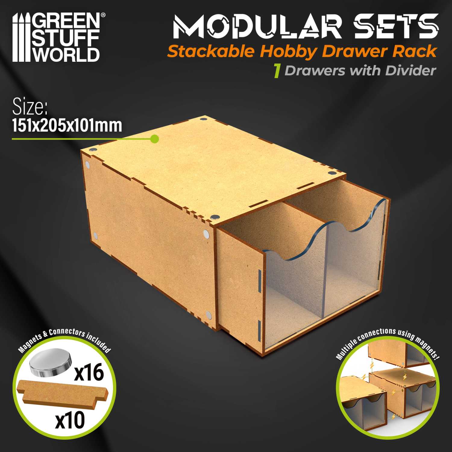 Keep your work table tidy with this stackable, magnetized storage module made of natural-colored MDF wood. High-precision laser-cut pieces for clean edges and a precise fit. Designed to fit perfectly with the rest of the modular accessories in the same family, allowing you to create a flexible and expandable organization system for paints, tools, and materials for both model making and crafts, expanding or reorganizing it as you wish whenever you change your setup.